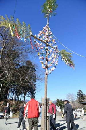 ひいちは約20センチ四方の座布団の布地にもみ殻を入れて縫い合わせ、ひもを付けて作る三角形の飾り。住民15人が早朝から長さ約10メートルのスギの棒にひいちや色紙、竹を飾り付け、地区内の道祖神近くの2カ所に立てた。ひいちは地区の住民有志でつくる「ポプラの会」メンバーらが昨年末に作った約180個を使用した。
