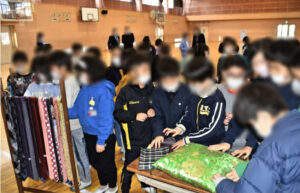 ネクタイや座布団に触り、織物の生地の質感を体感する児童ら=富士吉田・下吉田二小
