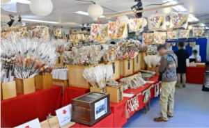 年末年始の参拝者を迎えるために設置された授与所。熊手や破魔矢などが並ぶ=富士吉田・北口本宮冨士浅間神社