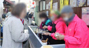 子の神社前で小規模などんど焼きをしたほか、市内の飲食店が焼きそばやおでん、ゆず茶、キムチなどの飲食物を販売=写真。福引やギターの演奏などもあり、多くの地域住民でにぎわった。